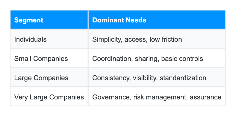 From there, clarity comes when you apply one lens at a time. Apply user count, and the base dominates. Apply revenue, and value concentrates at the top. Apply needs, and simplicity gives way to coordination and governance. Apply complexity, and it steadily increases as you move upward. The structure stays the same; only the perspective changes.